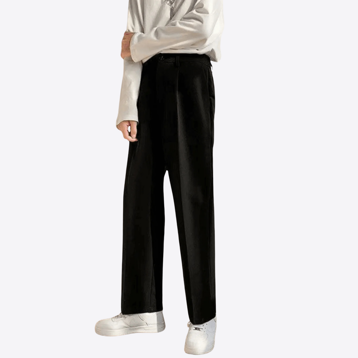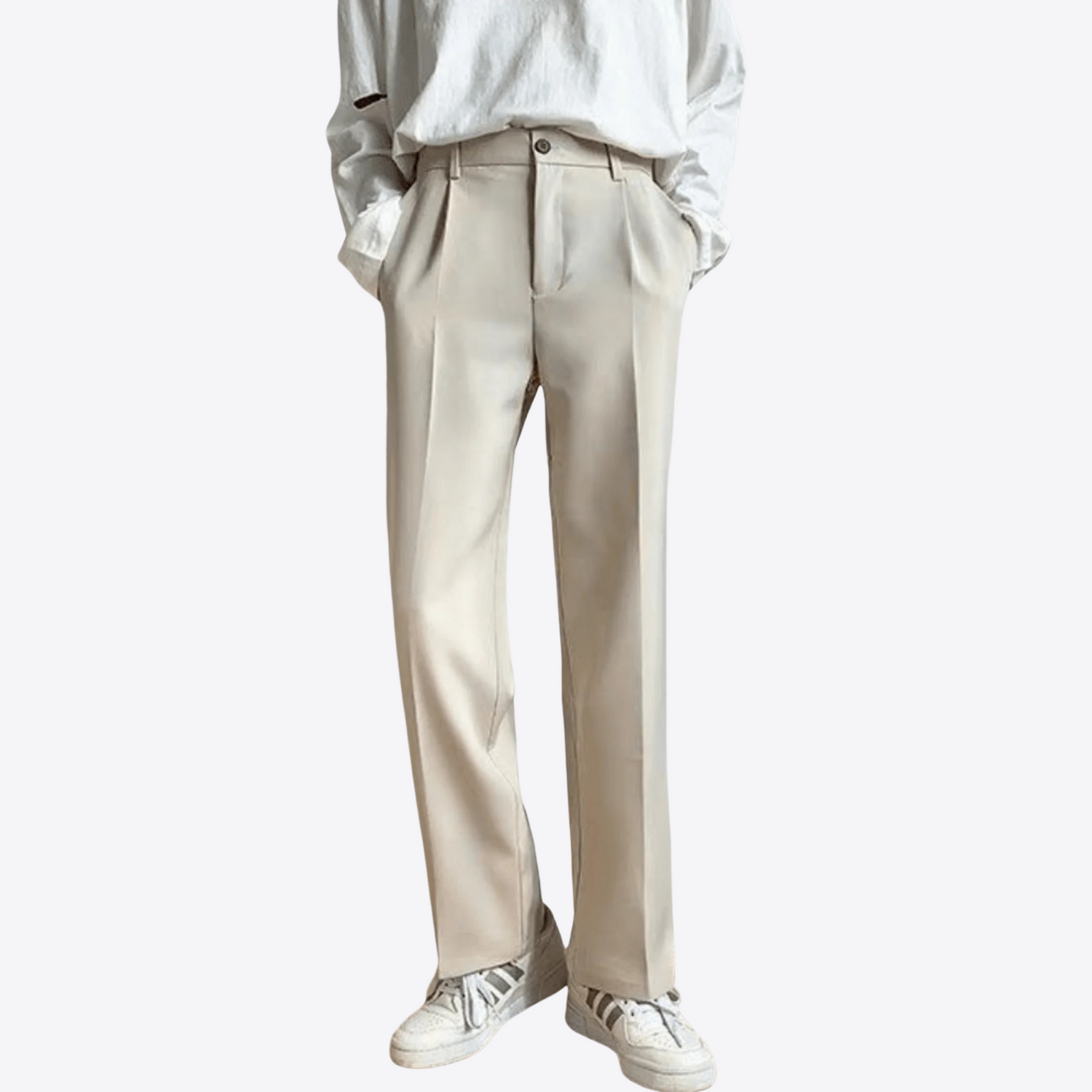 Plis marqués devant, jambe droite confortable. Passants de ceinture et poches pratiques, facile à porter au quotidien.