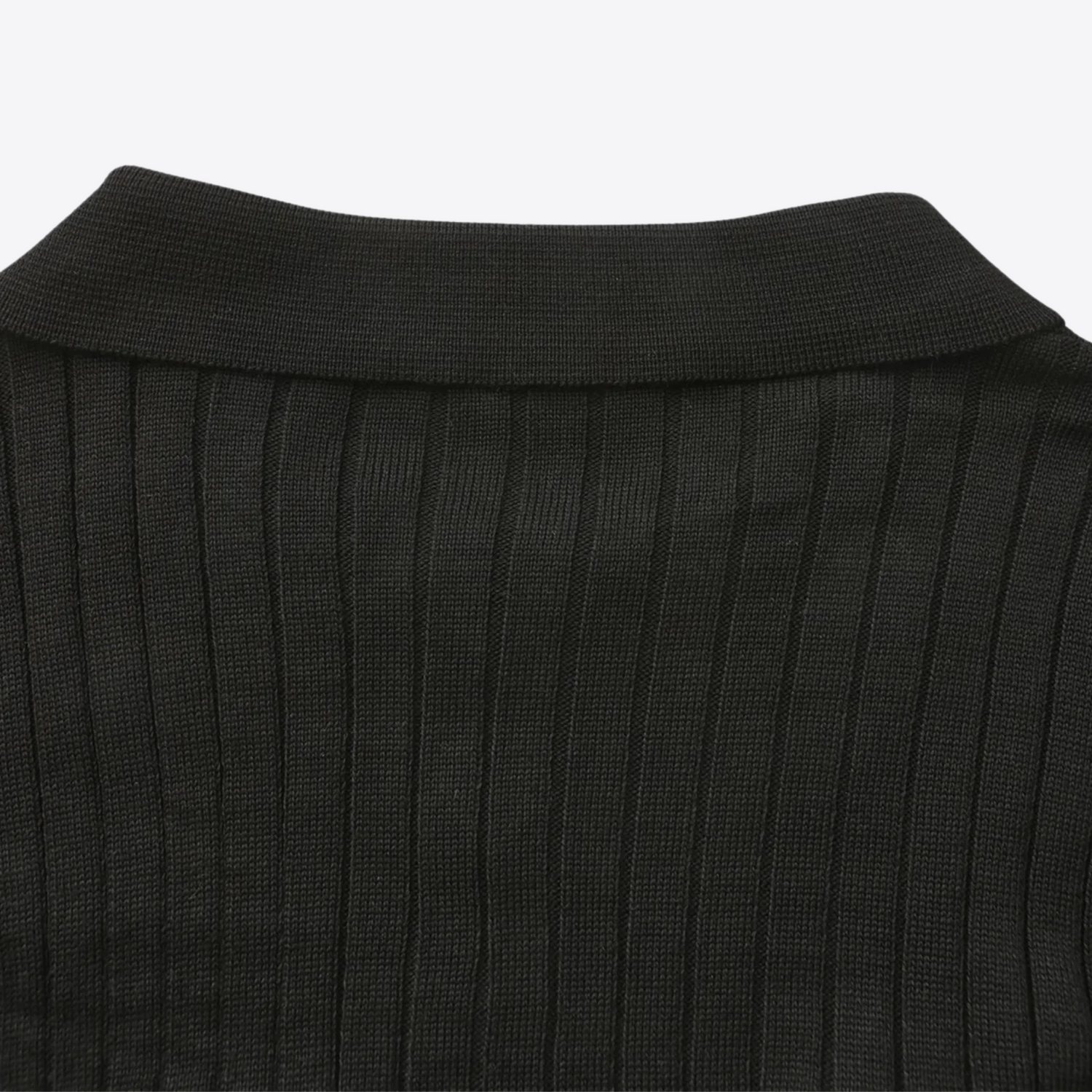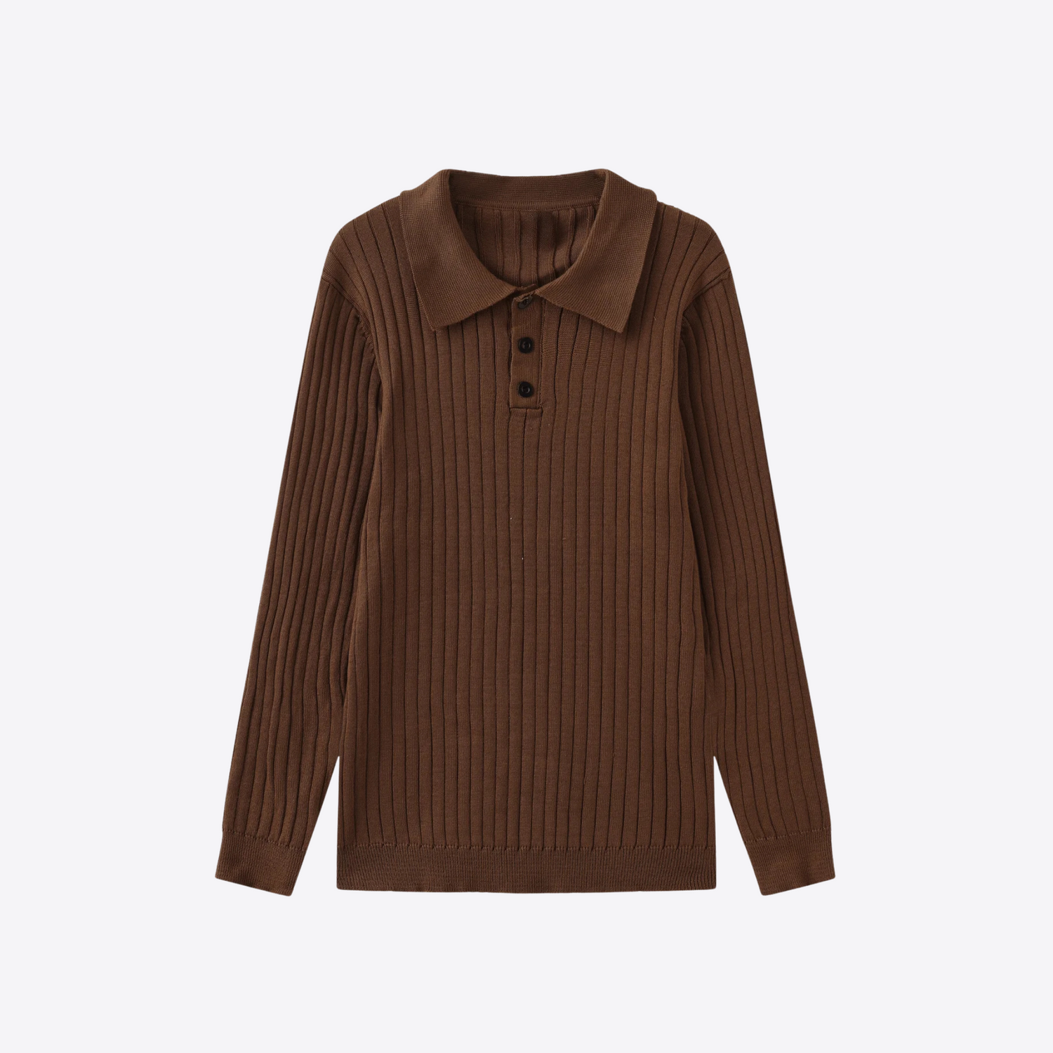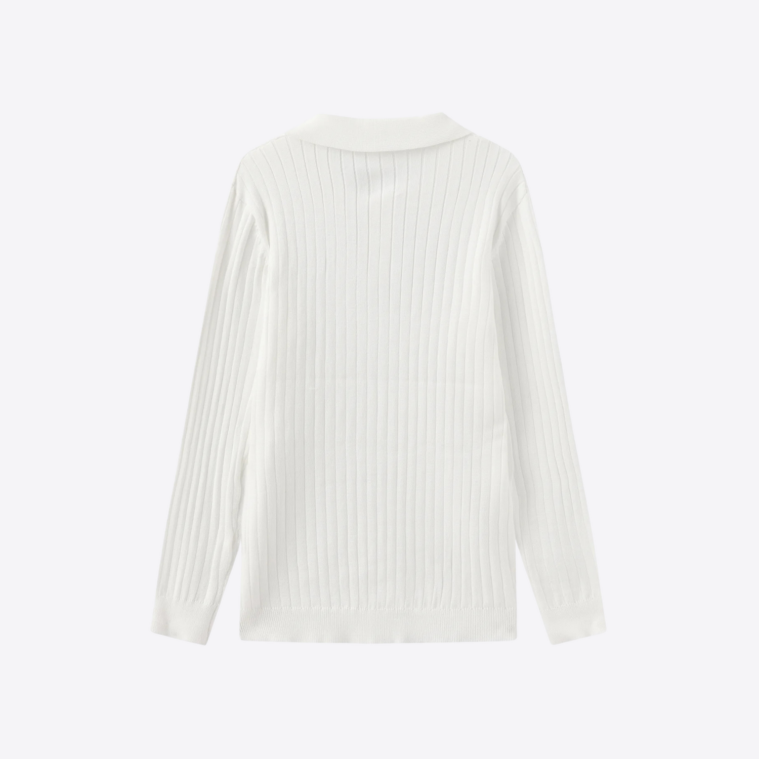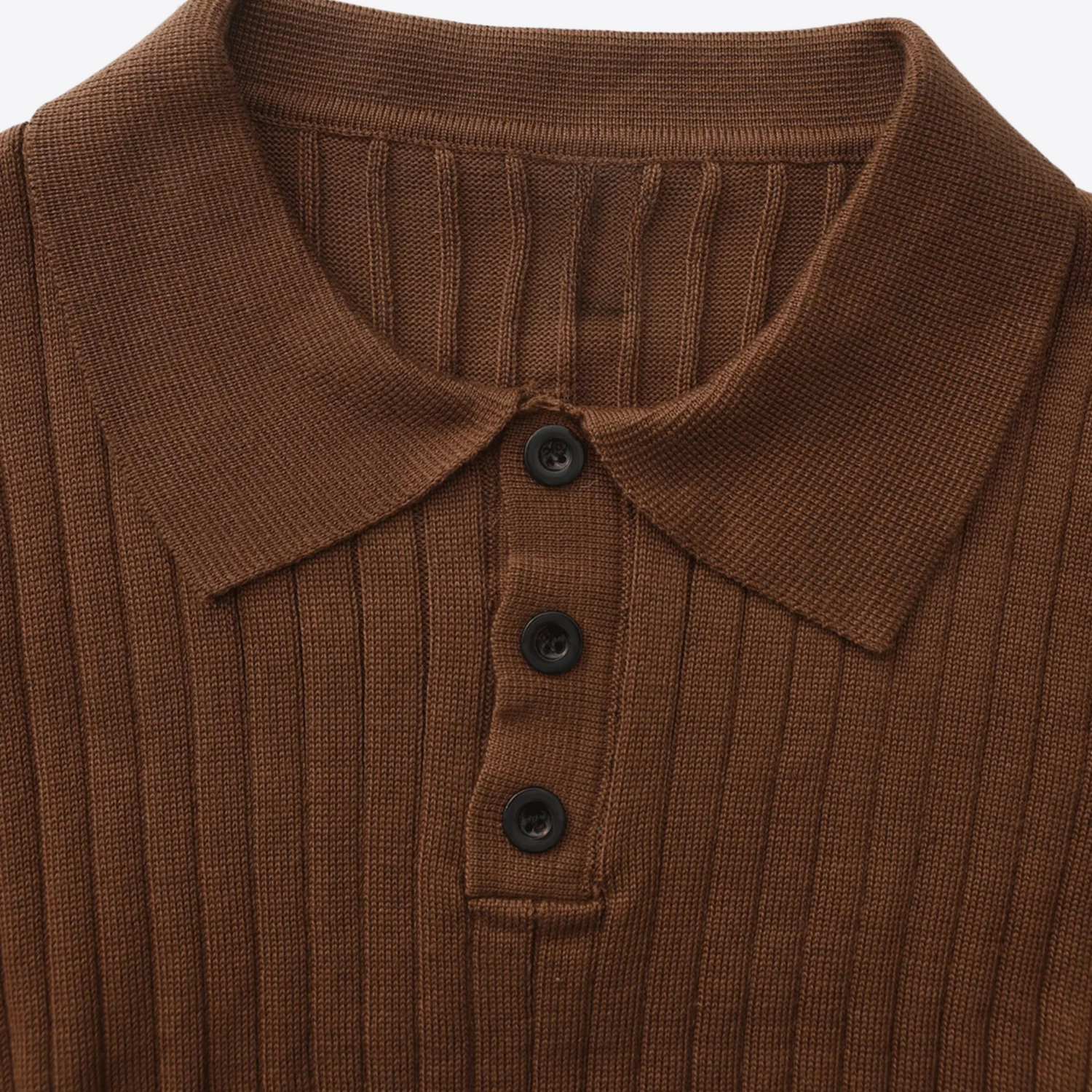 Le polo manches longues côtelée qui signe une élégance old money sans effort. Maille côtelée verticale (effet rayures), col polo tricoté et patte 3 boutons : une pièce texturée, confortable et nette du matin au soir.