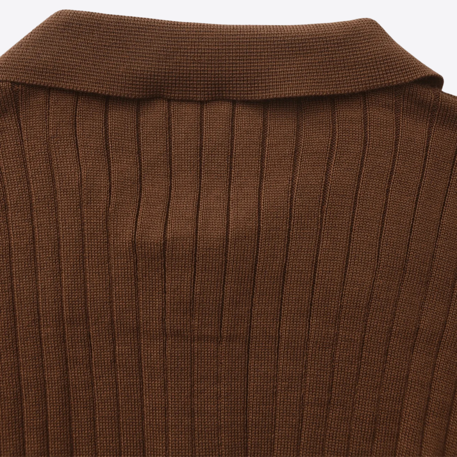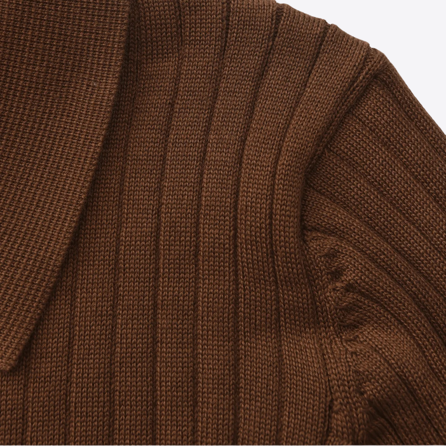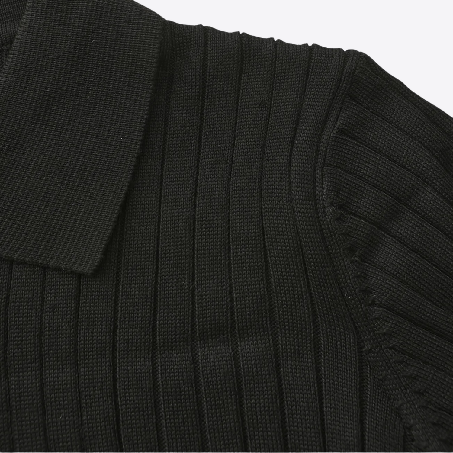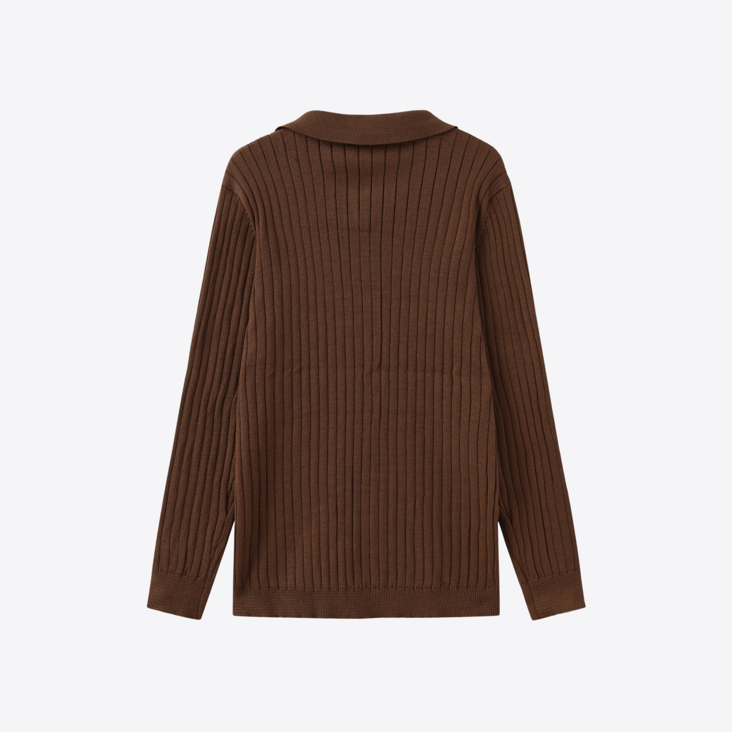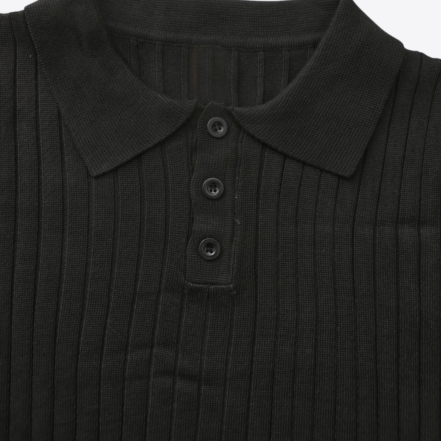 Le polo manches longues côtelée qui signe une élégance old money sans effort. Maille côtelée verticale (effet rayures), col polo tricoté et patte 3 boutons : une pièce texturée, confortable et nette du matin au soir.