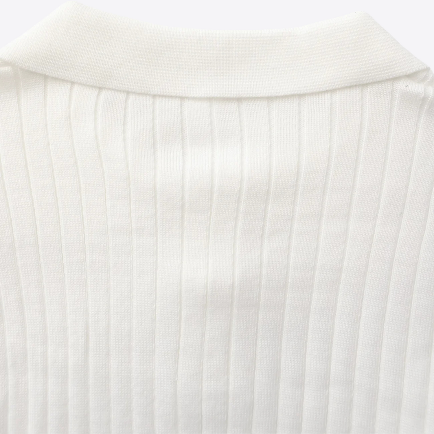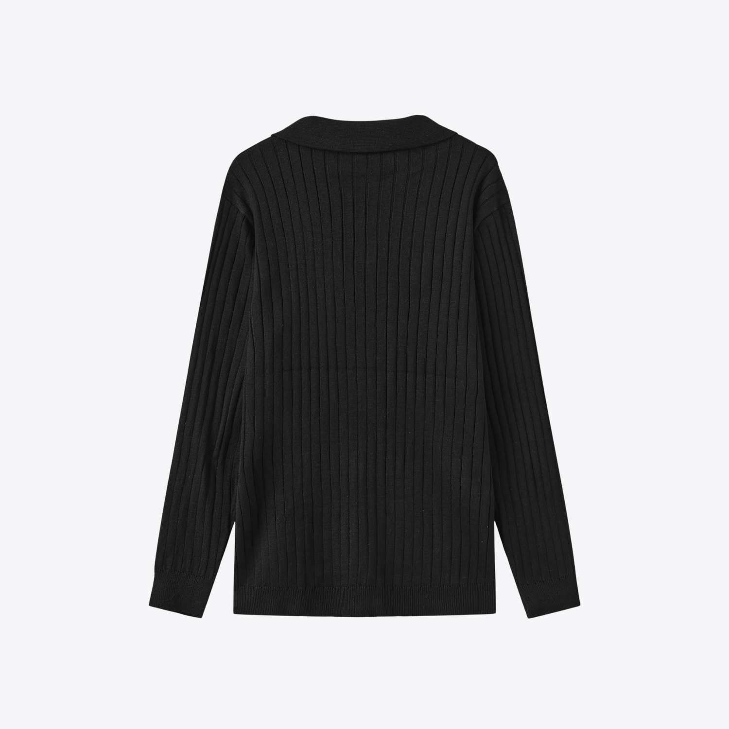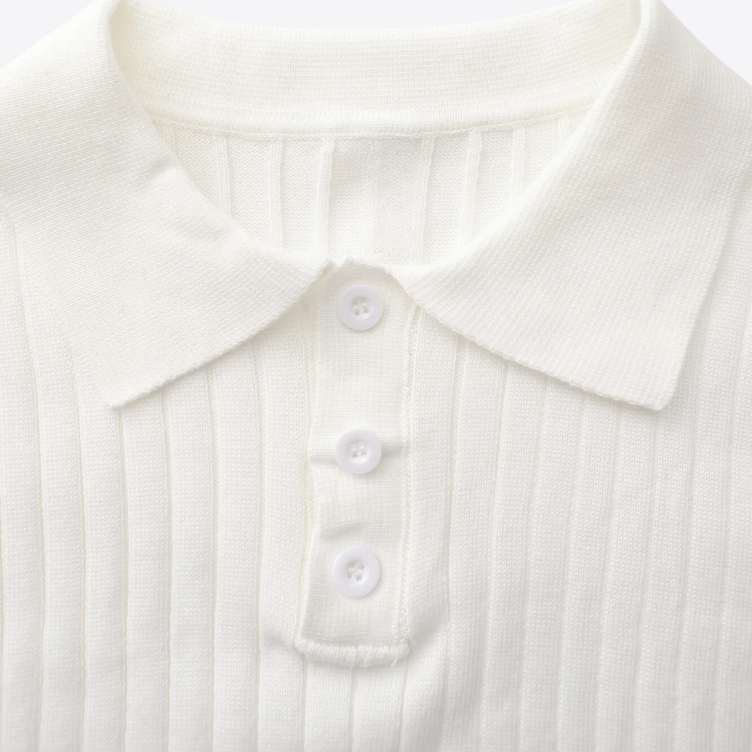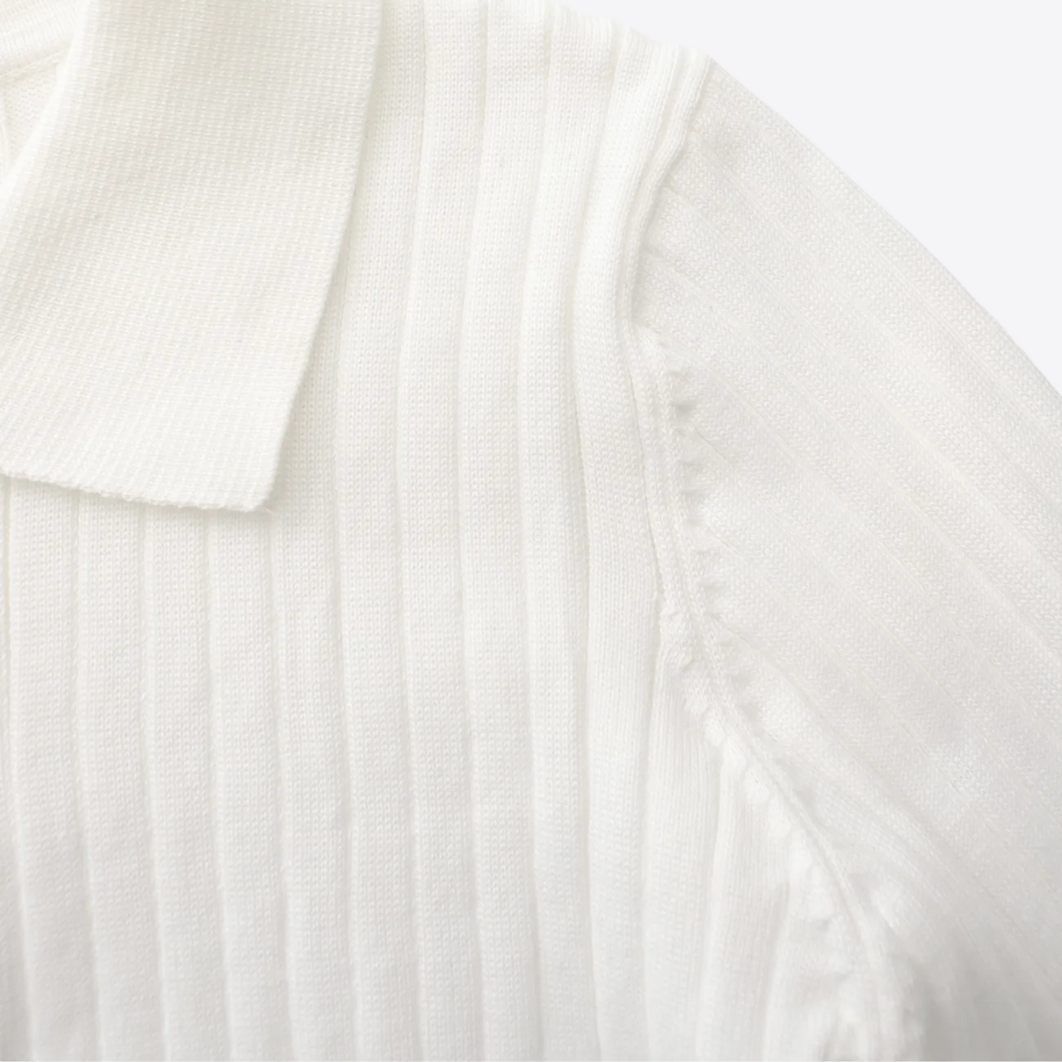 Le polo manches longues côtelée qui signe une élégance old money sans effort. Maille côtelée verticale (effet rayures), col polo tricoté et patte 3 boutons : une pièce texturée, confortable et nette du matin au soir.