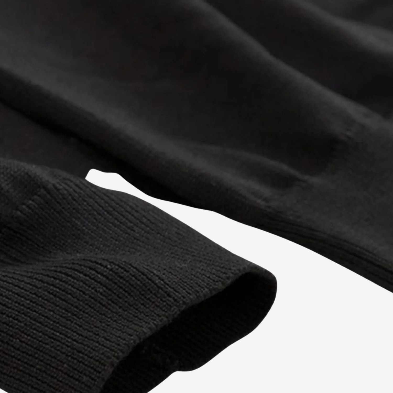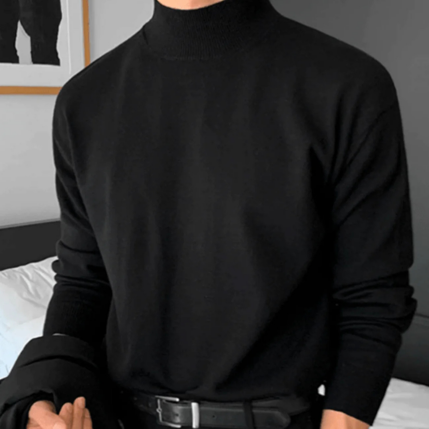 Le basique sobre qui fait toute la différence. Col montant fin (mock-neck), bords-côtes nets et maille douce au tombé propre : ce pull minimaliste pose une allure old money instantanée, seul ou sous un blazer.