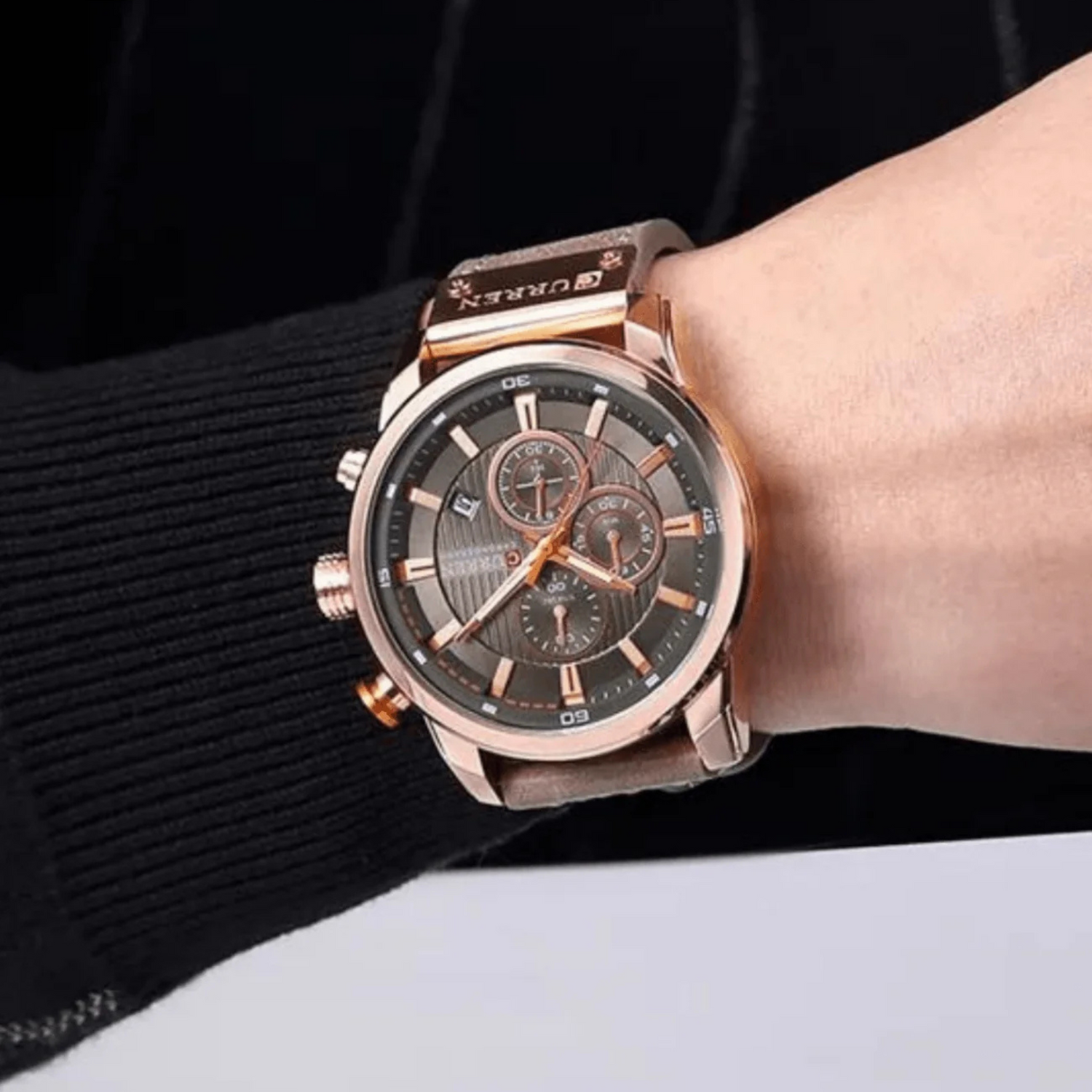 Sport-luxe, esprit old money. Cadran anthracite profond, accents or rose, boîtier poli et silhouette chronographe : une montre de caractère, élégante sans être tape-à-l’œil ; parfaite du bureau au dîner.
