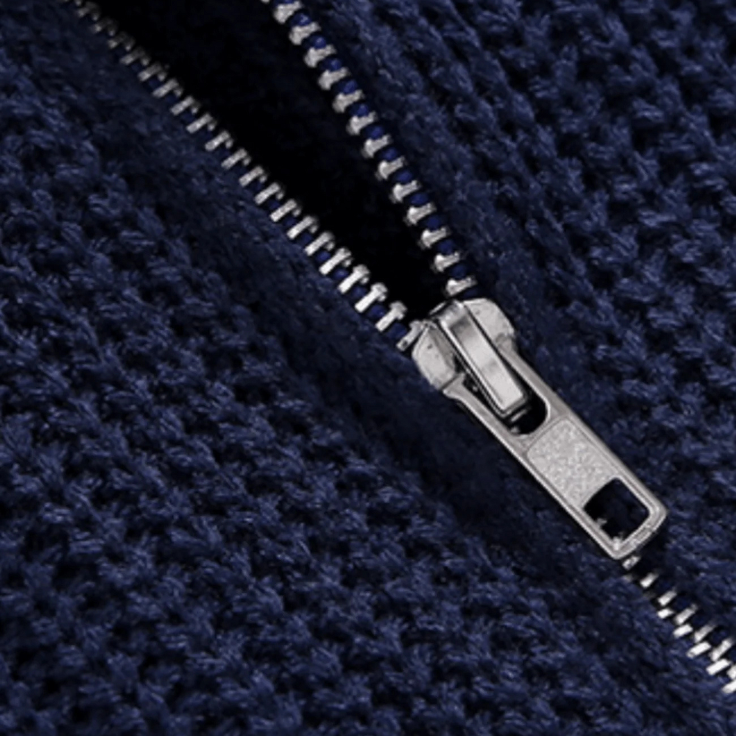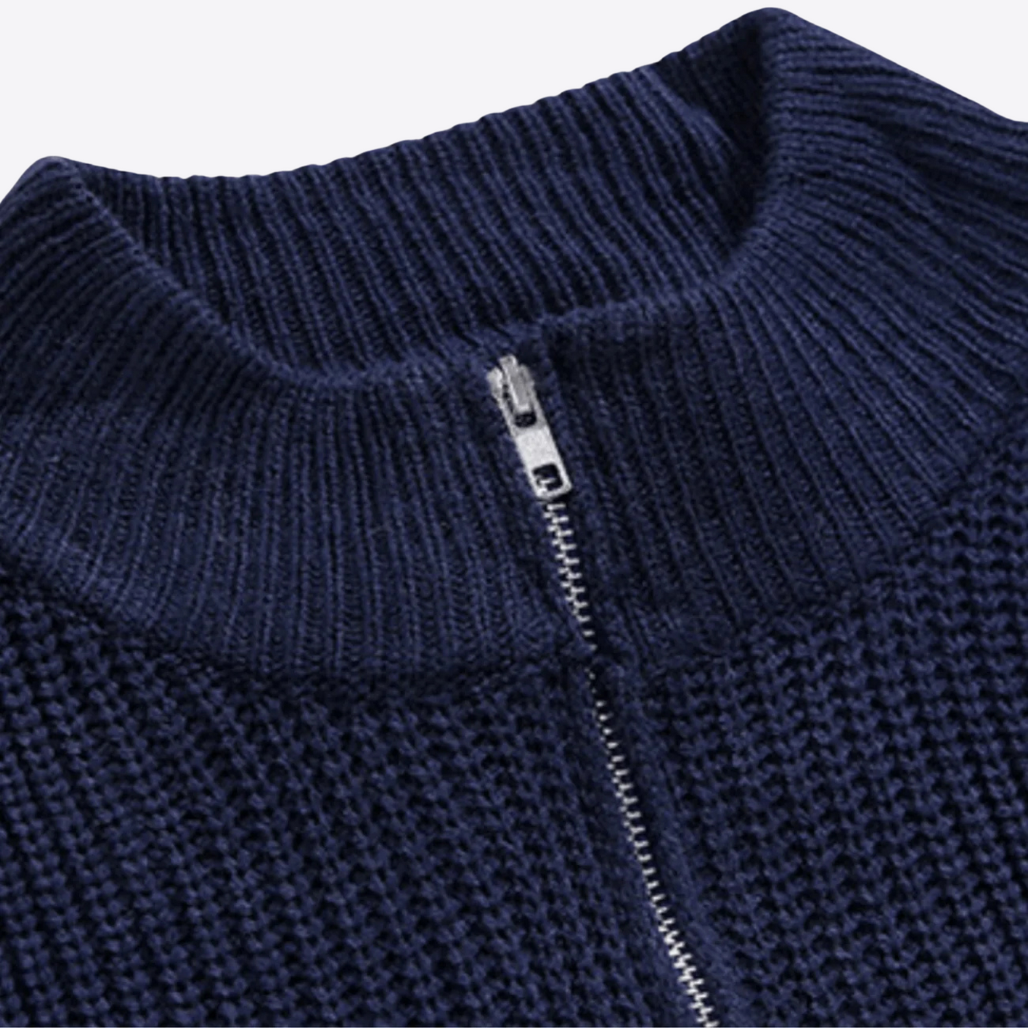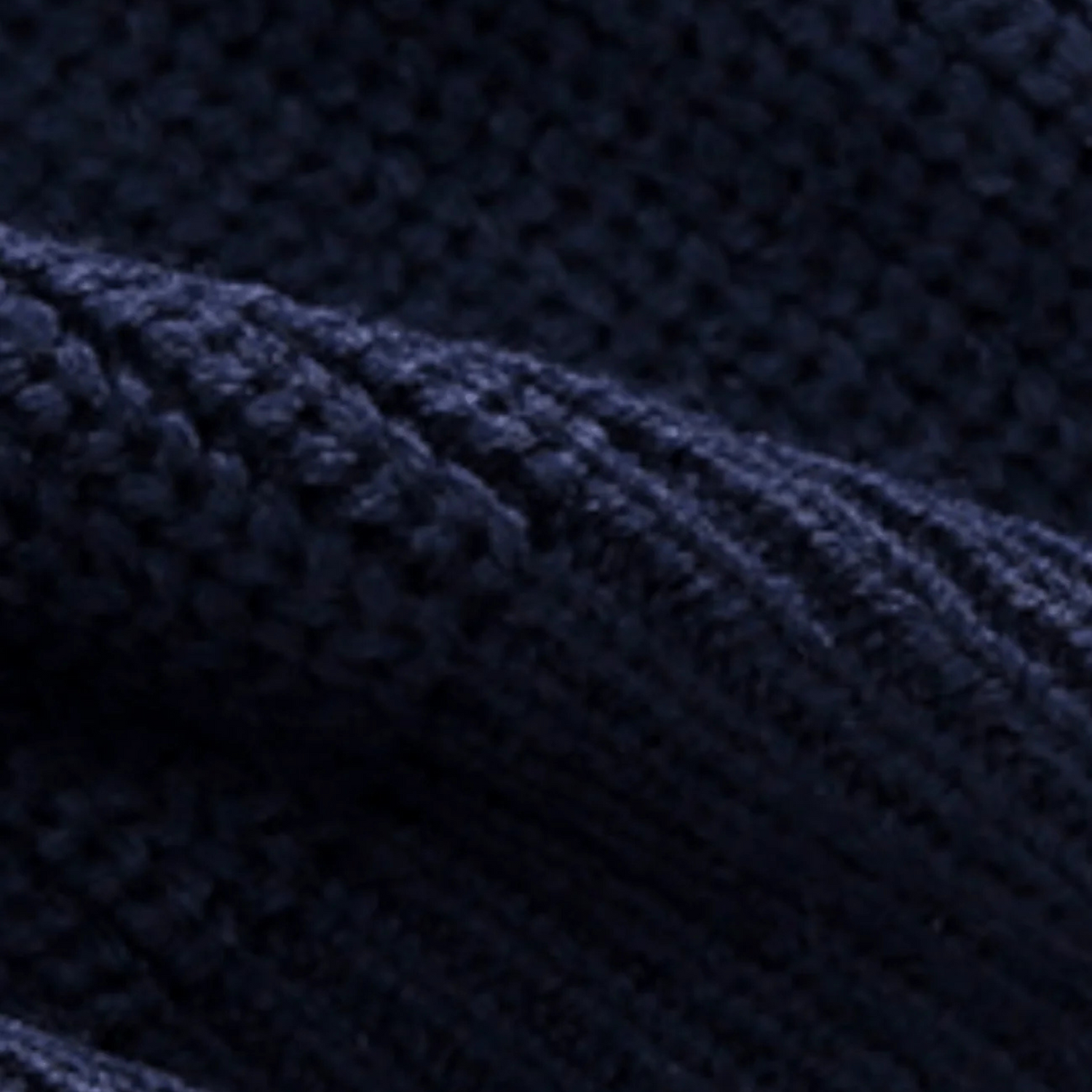 Minimaliste, rétro, impeccablement chic. Profondo réinterprète le ¼ zip avec un col montant côtelé et une maille texturée bleu nuit qui structure la silhouette — parfaite sous un manteau, un blazer ou portée seule.