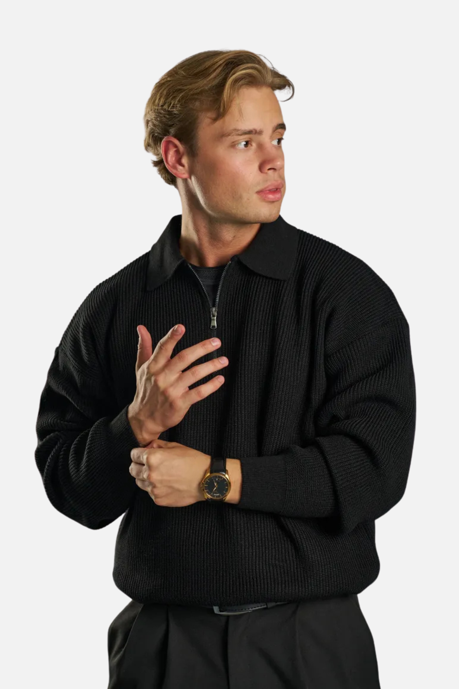 Élégance fonctionnelle : la fermeture éclair intégrale permet un tombé ajusté, tandis que les manches longues apportent une chaleur discrète. Tissé en coton et polyester, ce pull conjugue douceur, structure et sobriété pour un style intemporel.