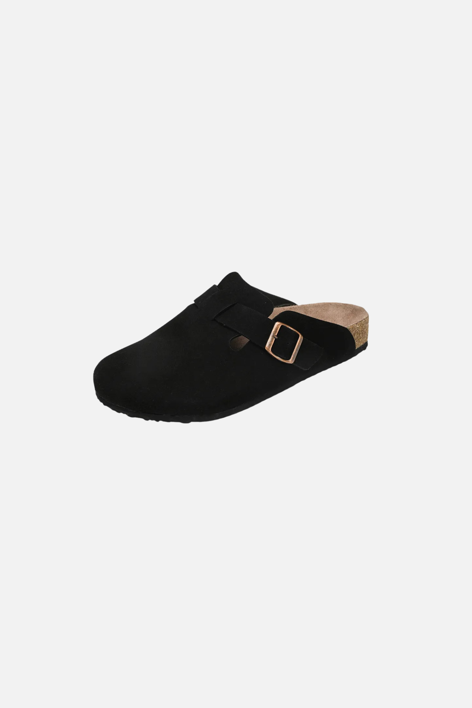 Signature Maison Dorléac, ces sabots en suède Héritage misent sur une silhouette épurée : bride réglable à boucle, tige douce et semelle légère au confort quotidien — la touche quiet luxury du jean au pantalon en lin.