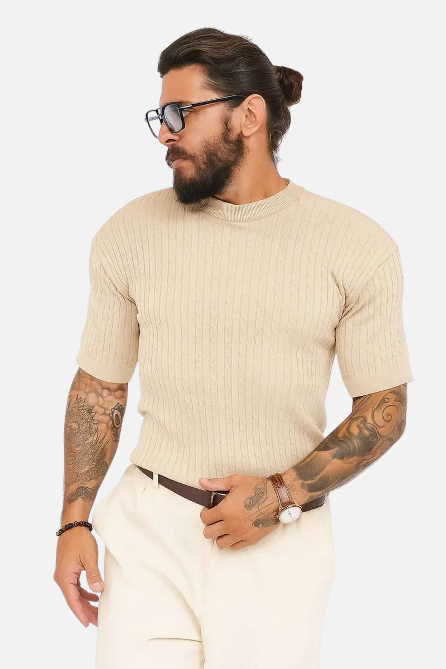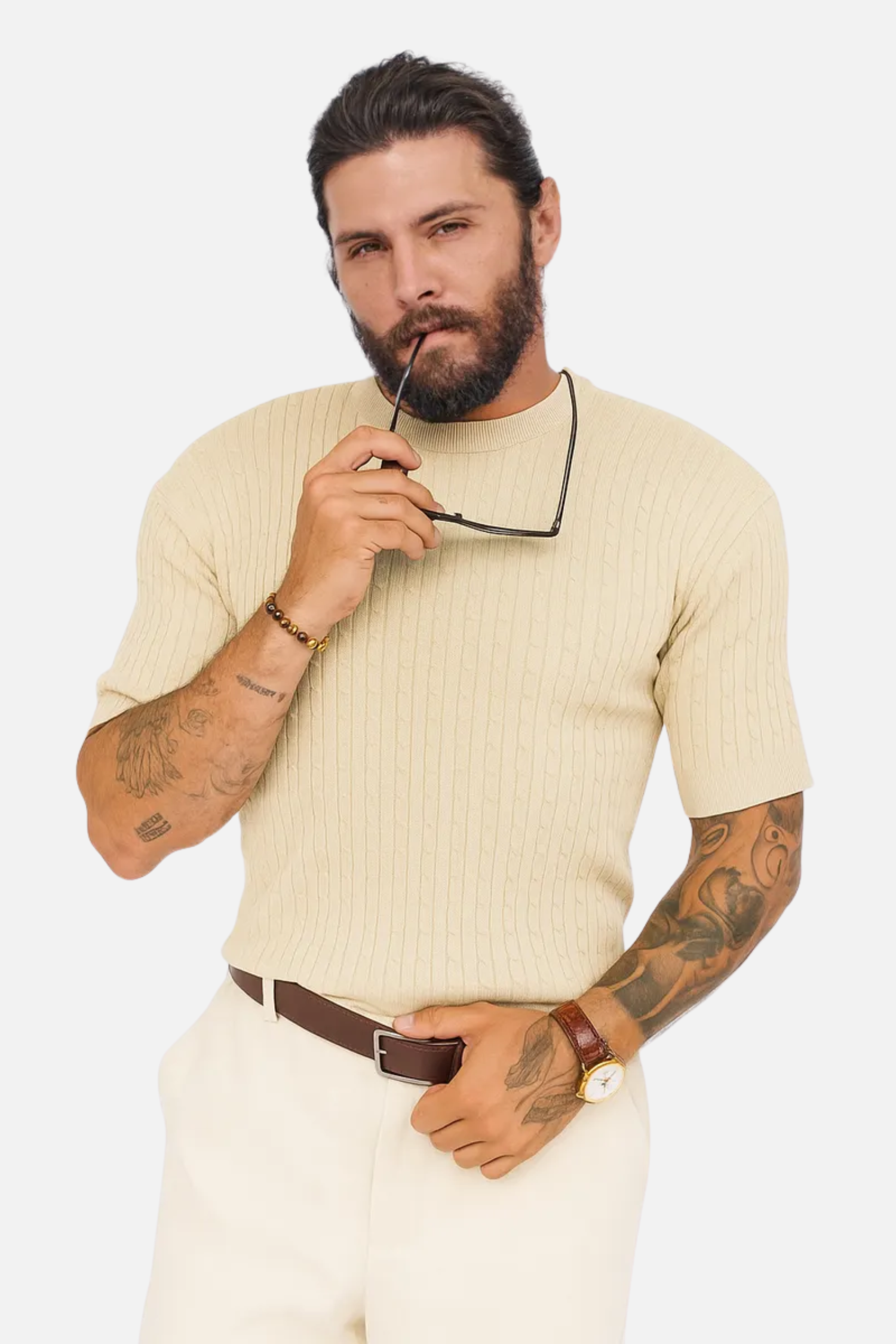 T-SHIRT TORSADÉ — l’allure « old money » en version légère. Maille douce à relief torsadé, col rond propre et manches mi-longues pour une silhouette nette et élégante. Parfait avec un chino, un jean brut ou sous une veste.
